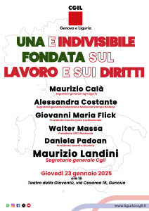 “Una e indivisibile fondata sul lavoro e sui diritti” è il titolo dell’incontro organizzato dalla Cgil per giovedì 23 gennaio 2025 alle ore 16 presso il Teatro della Gioventù in Via Cesarea 16 a Genova. L’incontro rappresenta la prosecuzione della mobilitazione sui referendum promossi o sostenuti dalla Cgil che chiede di votare cinque sì ai cinque quesiti sui temi della cittadinanza, licenziamenti, sicurezza sul lavoro, precariato, Jobs Act. Insieme alle problematiche legate al mondo del lavoro, verranno affrontate le principali questioni che riguardano la tenuta democratica del Paese dalla libertà di stampa al Ddl Sicurezza. Per quanto riguarda il referendum sull’autonomia differenziata, non ammesso dalla Corte Costituzionale, in attesa di conoscere le ragioni dell’inammissibilità, la Cgil ribadisce la propria netta contrarietà e parteciperà a tutte le iniziative necessarie per abrogarla.