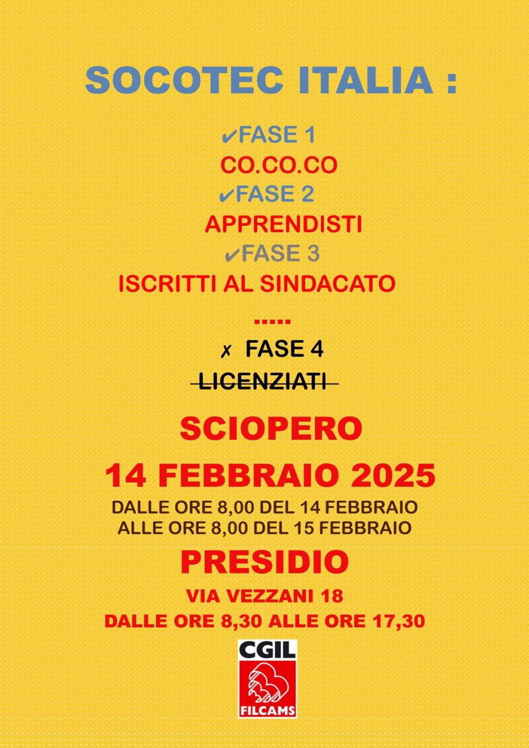 Alla Socotec Italia di Genova, leader europeo nel campo delle ispezioni, test e certificazioni delle costruzioni e delle infrastrutture che conta un migliaio di dipendenti in Italia e una ottantina nella sede di Rivarolo hanno licenziato ingiustamente due giovani tecnici. La Filcams Cgil ha organizzato per venerdì 14 febbraio davanti alla sede dell’Azienda in Vezzani 8 uno sciopero contro una decisione ingiustificata.