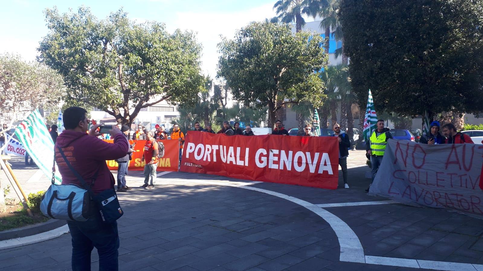 Alla manifestazione di ieri mattina, in occasione dello sciopero del Porto di Napoli, erano presenti anche delegazioni di lavoratori dei porti di Genova e Savona, oltre a Livorno, Ravenna, Civitavecchia, Bari, Brindisi, Cagliari, Gioia Tauro, Salerno e Palermo.