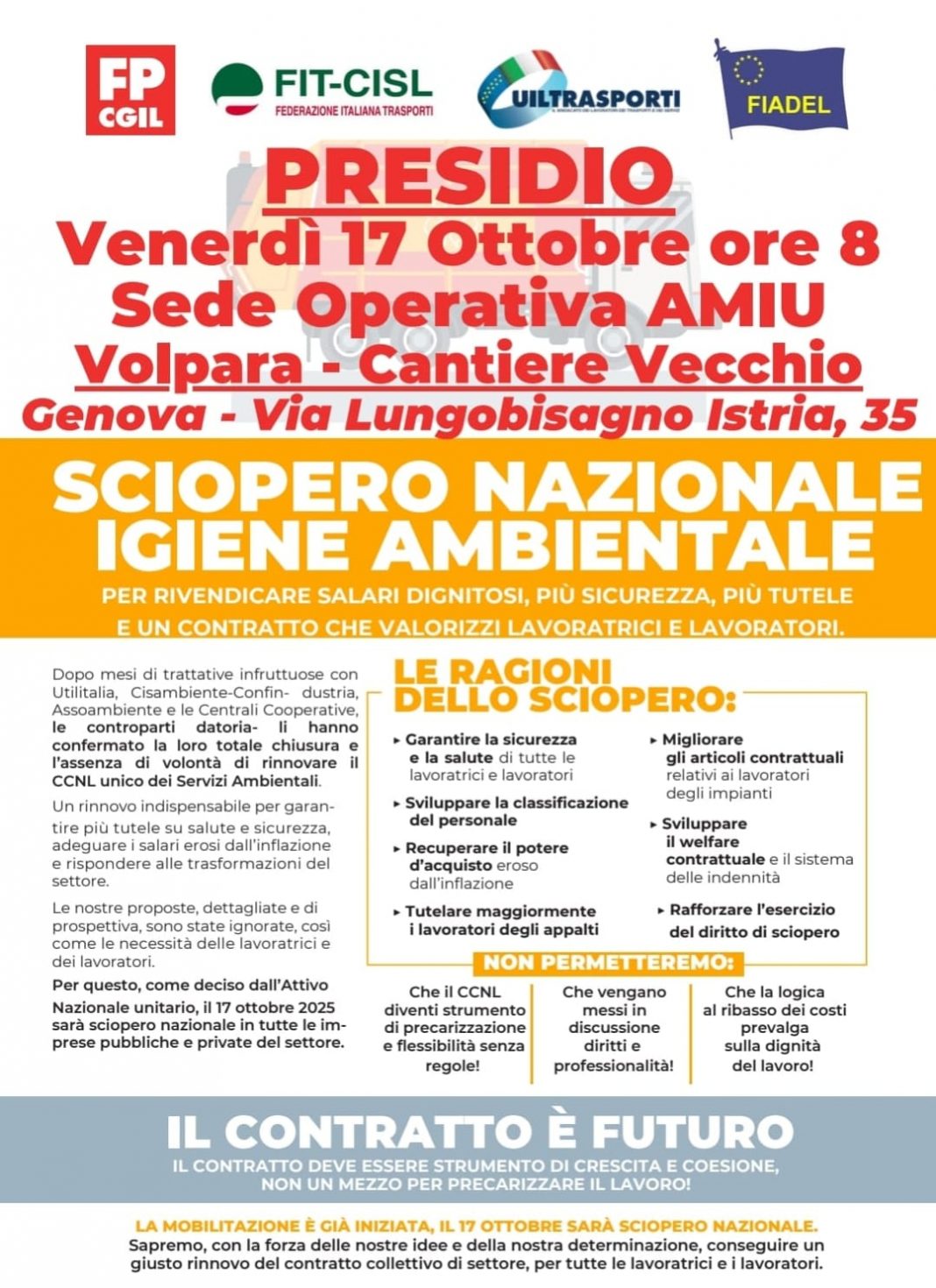 Venerdì 17 ottobre in tutta Italia sarà sciopero del comparto dell’igiene ambientale. Il contratto collettivo è scaduto da quasi un anno e dopo mesi di trattative infruttuose con Utilitalia, Cisambiente-Confindustria, Assoambiente e Centrali Cooperative, i sindacati Fp Cgil Fit Cisl Uiltrasporti Fiadel hanno deciso di proclamare sciopero “La questione economica è solo uno degli aspetti al centro del rinnovo – spiegano gli organizzatori – la nostra piattaforma chiede maggiori investimenti su capitoli importanti come salute e sicurezza, riconoscimento delle professionalità, rafforzamento del welfare, maggiori tutele per i lavoratori degli appalti”.