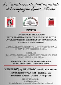 ore 10.00 Acciaieria d’Italia Contro ogni terrorismo: UNITA’, FRATELLANZA E ACCOGLIENZA fra tutti i lavoratori senza distinzione di provenienza, di religione e nazionalità. La Camera del Lavoro di Genova, la FIOM CGIL di Genova e la Società di Mutuo Soccorso G. Rossa il 24 gennaio 2024 presso il Magazzino Transiti dello stabilimento di Genova-Cornigliano ricordano il compagno Guido Rossa, barbaramente assassinato dalle Brigate Rosse il 24 gennaio 1979. Le conclusioni saranno affidate a Maurizio Landini, Segretario Generale Cgil.