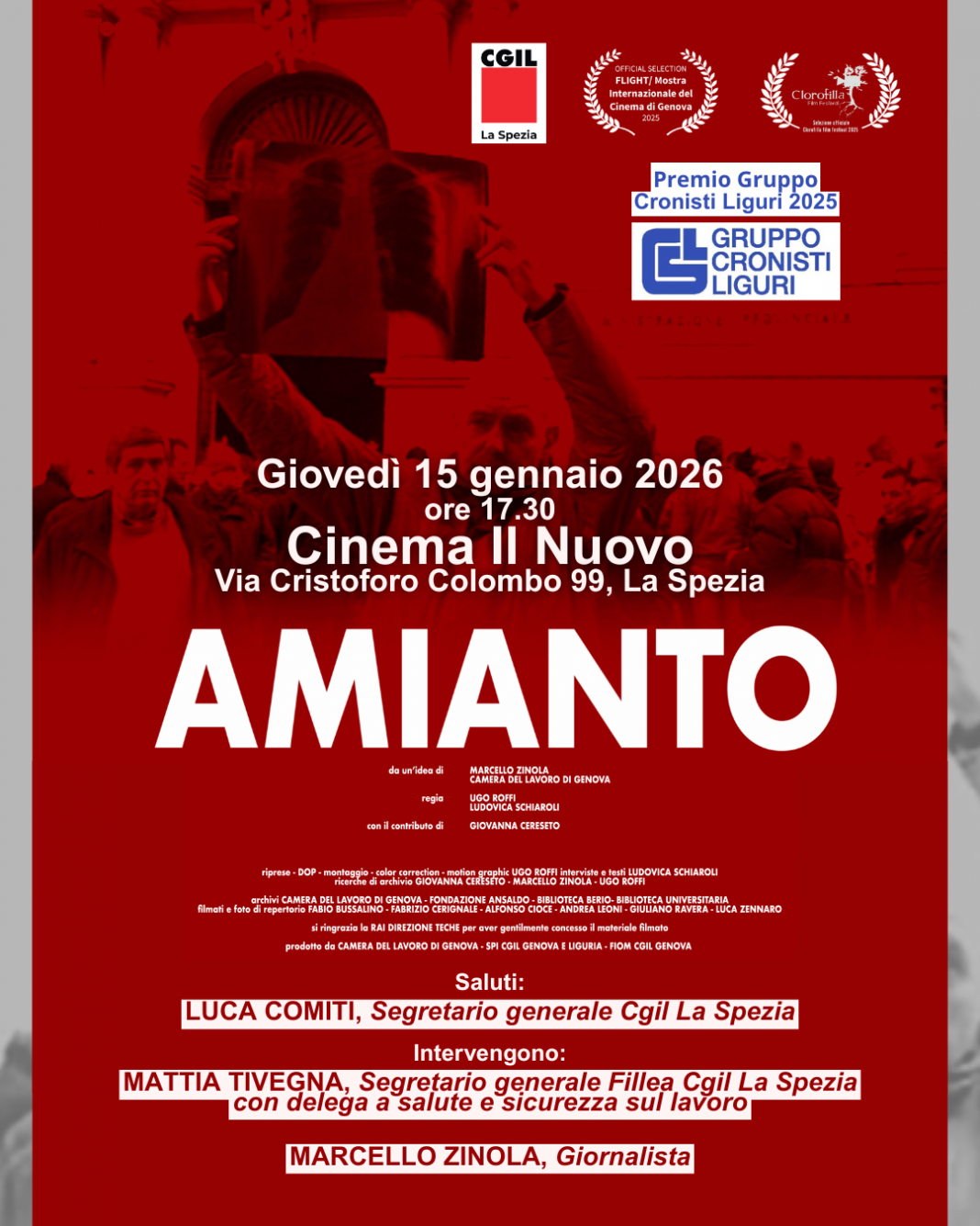 Alla proiezione parteciperanno Luca Comiti, Segretario generale della Camera del Lavoro della Spezia, Mattia Tivegna, Segretario della Fillea Cgil della Spezia con delega alla sicurezza sul lavoro, i registi Ugo Roffi e Ludovica Schiaroli, e il giornalista Marcello Zinola.