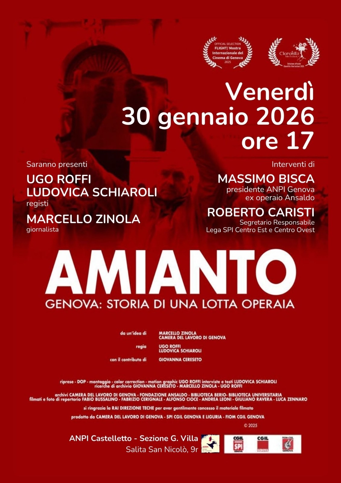 Sarà proiettato venerdì 30 gennaio 2026 alle ore 17.00, presso ANPI Castelletto – Sezione G. Villa Salita San Nicolò 9r, il docufilm “Amianto. Genova: storia di una lotta operaia”, che racconta una battaglia sindacale durata oltre dieci anni, condotta dalla classe operaia genovese per il riconoscimento dei propri diritti e della propria dignità.