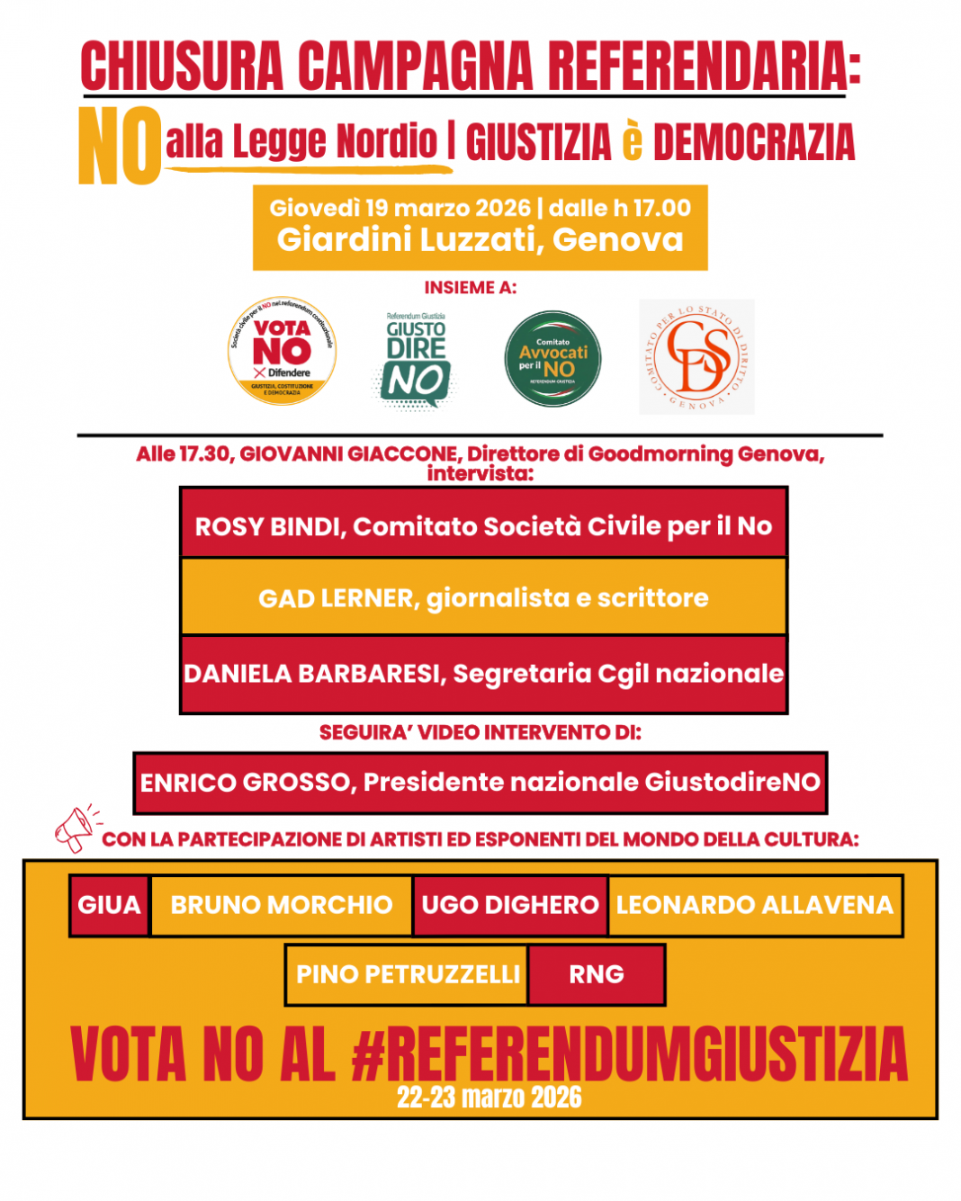 Giovedì 19 marzo 2026 a partire dalle ore 17,00 ai Giardini Luzzati si terrà la chiusura della campagna referendaria per il NO al referendum costituzionale sulla giustizia.