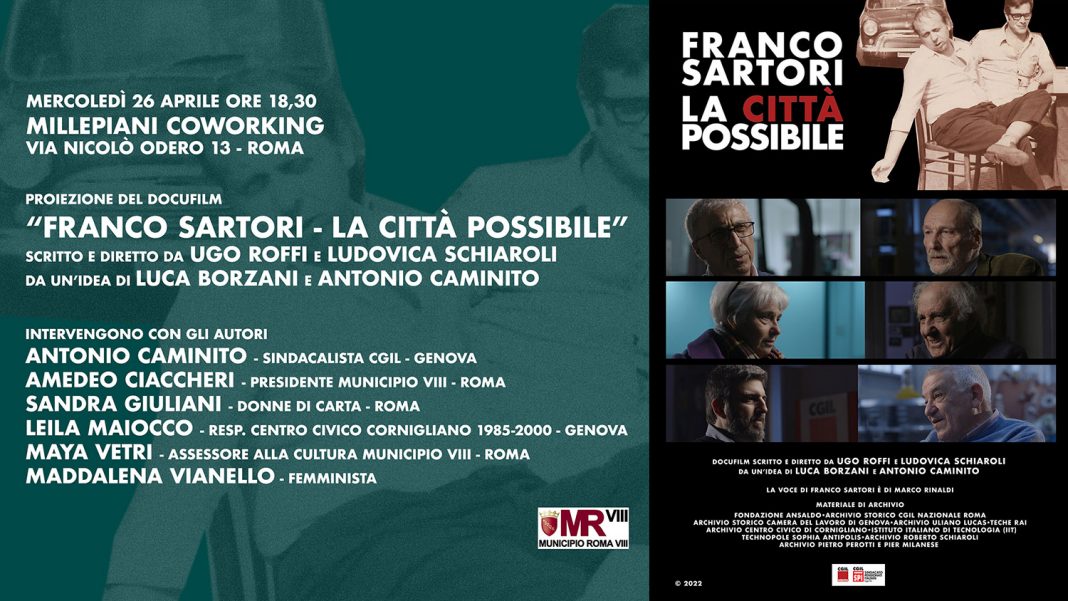 Roma 22 aprile 2023. Si svolgerà a Roma mercoledì 26 aprile alle 18:30 presso Millepiani Coworking in via Nicolò Odero, 13 la seconda proiezione del docufilm “Franco Sartori – La città possibile che racconta le trasformazioni del ponente genovese tra gli anni Ottanta e Novanta attraverso l’impegno politico sindacale di Franco Sartori (1941-1996).