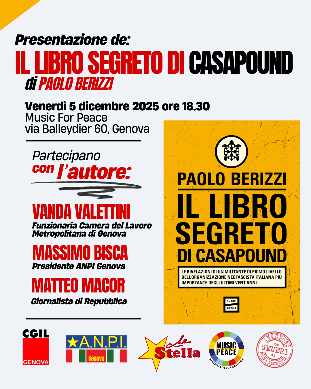 Si terrà venerdì 5 dicembre alle ore 18,30 presso Music For Peace in via Balleydier 60 a Genova, la presentazione del libro di Paolo Berizzi “Il libro segreto di CasaPound”. “La paura, e la voglia di raccontare tutto. Ho iniziato a frequentare CasaPound nel 2003. Prima avevo frequentato altri gruppi neofascisti, per esempio Meridiano Zero, quello dove è transitato anche il ministro Alessandro Giuli. Cercavo un luogo dove incontrarmi con altri fratelli che condividevano un’idea. Sono passati ventidue anni e ci sono ancora. Se e quando deciderò di andarmene, so che proveranno a farmela pagare. Lo hanno già fatto con gli altri”. Comincia così questo libro che raccoglie una testimonianza straordinaria dall’interno di un mondo da sempre inaccessibile, chiuso e protetto. Perché a 80 anni dalla fine della guerra e dell’occupazione nazi fascista nel nostro Paese è ancora così importante parlare di questi temi? Quali sono i pericoli che corre la nostra democrazia con l’espandersi di ideologie che si rifanno a uno dei momenti più bui della storia recente del nostro Paese? Questi e altri temi saranno al centro della discussione di venerdì alla quale parteciperanno, insieme all’autore, Vanda Valettini funzionaria della Camera del Lavoro Metropolitana di Genova, Massimo Bisca Presidente Anpi Genova e Matteo Macor giornalista di Repubblica.