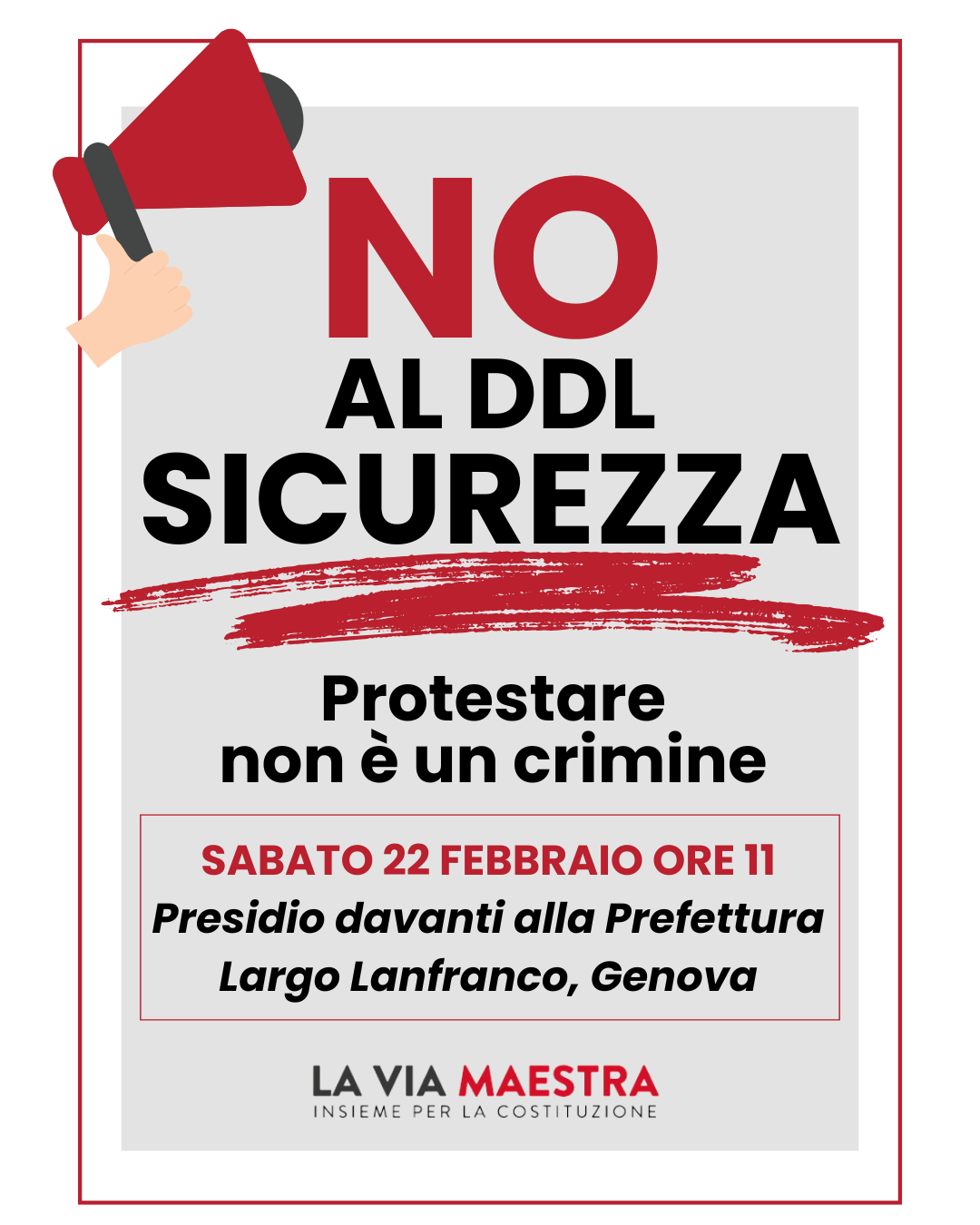Si terrà sabato 22 febbraio 2025 alle ore 11 il presidio con flash mob delle associazioni della Via Maestra contro il ddl Sicurezza. La Rete nazionale NO Ddl Sicurezza ha organizzato per sabato nelle principali piazze italiane, manifestazioni e iniziative pubbliche per respingere un disegno di legge autoritario che impedisce il pacifico e pubblico dissenso. La manifestazione di Genova è promossa anche dal Tavolo NO AD.