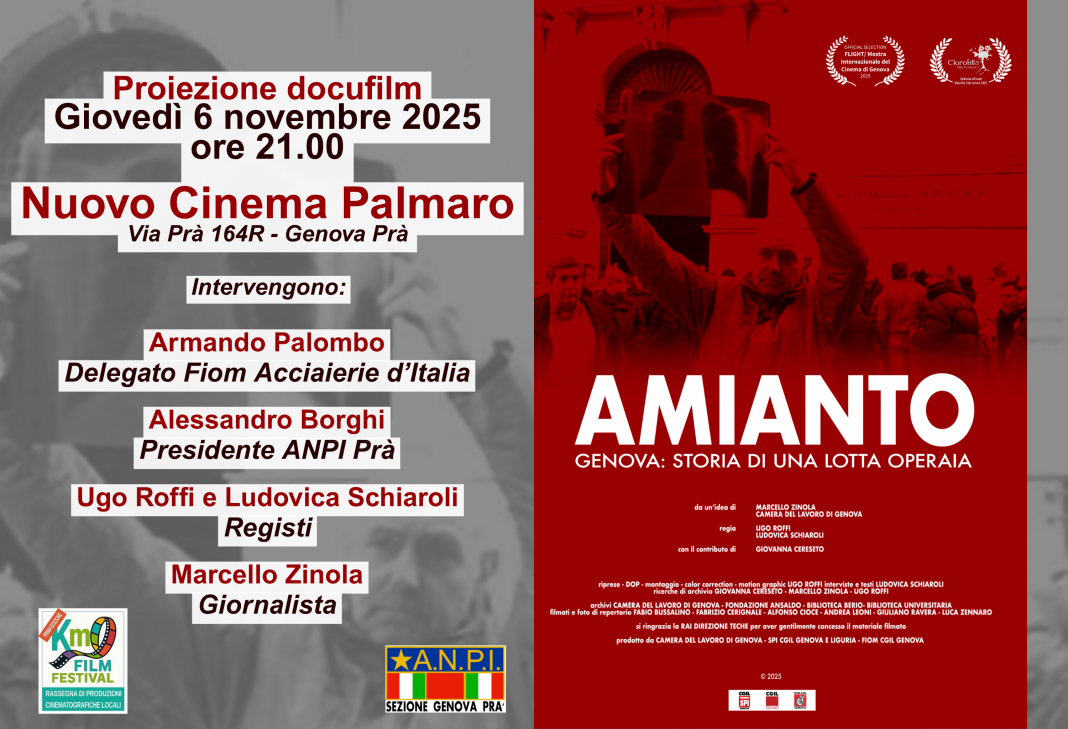 Sarà proiettato giovedì 6 novembre alle 21:00 al Nuovo Cinema Palmaro il docufilm “Amianto. Genova: storia di una lotta operaia” che racconta la battaglia sindacale, durata oltre 10 anni, che ha coinvolto la classe operaia genovese per vedersi restituire i propri diritti.