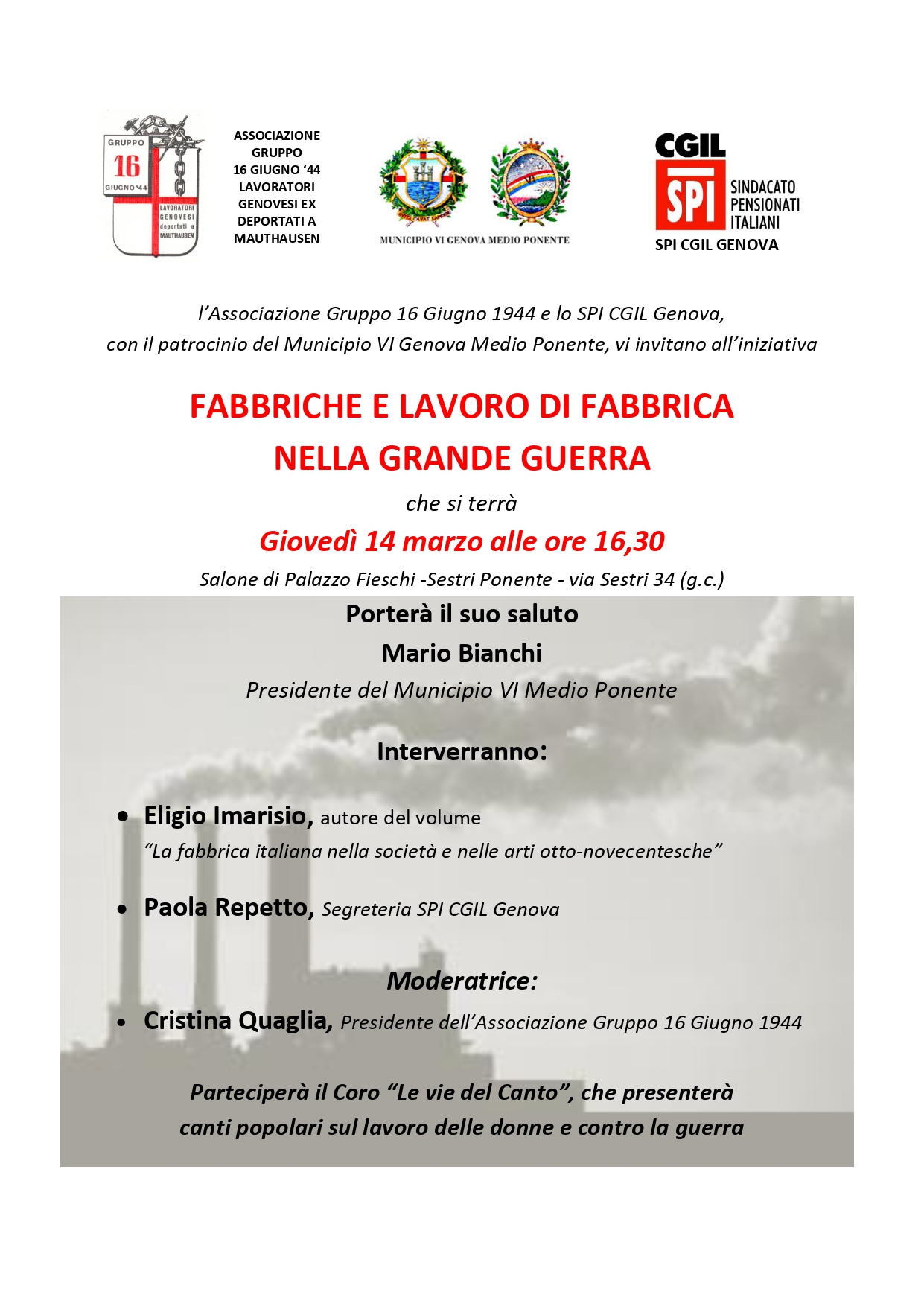 In occasione della giornata internazionale della donna lo SPI CGIL Genova con l’Associazione Gruppo 16 Giugno, ha organizzato l’iniziativa “Fabbriche e lavoro di fabbrica nella grande guerra” -con particolare riferimento al lavoro delle donne- che si terrà Giovedì 14 marzo alle ore 16.30 nel salone di Palazzo Fieschi, in Via Sestri, Genova
