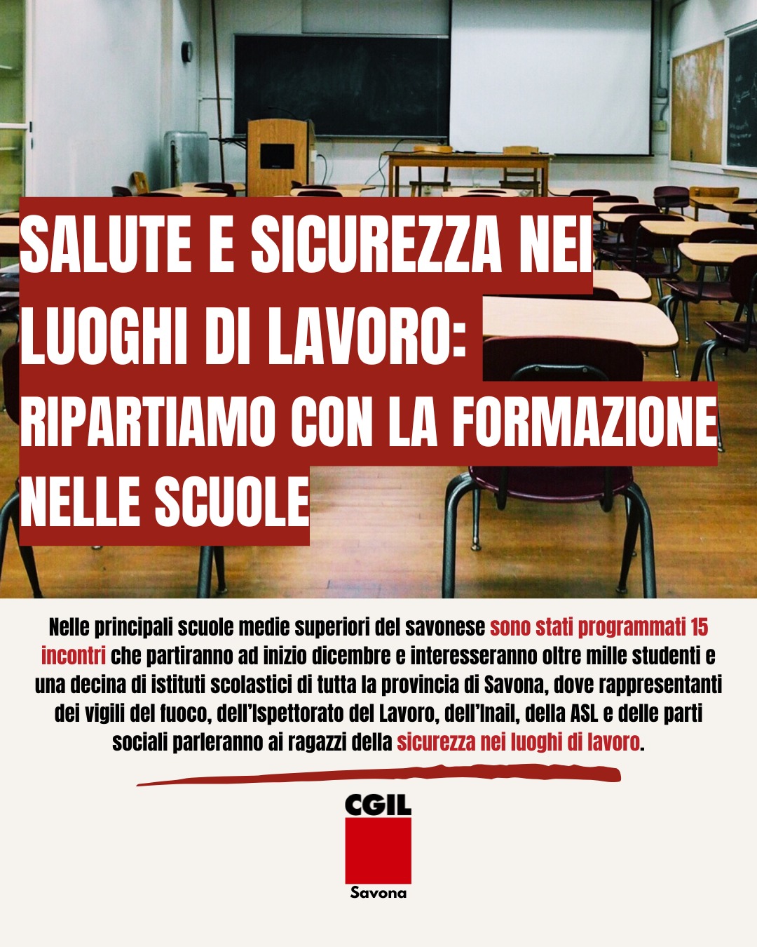 Nelle principali scuole medie superiori del savonese sono stati programmati 15 incontri che partiranno ad inizio dicembre per concludersi a metà marzo del prossimo anno interesseranno oltre mille studenti e una decina di istituti scolastici di tutta la Provincia di Savona ,dove rappresentanti dei vigili del fuoco, dell’Ispettorato del Lavoro, dell’Inail, della ASL e delle parti sociali parleranno ai ragazzi della sicurezza nei luoghi di lavoro, le norme contrattuali, il primo soccorso e il rischio incendio.