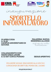 Si terrà mercoledì 1 aprile alle ore 15,30 presso il Campus Universitario di Savona in via Magliotto 2 l’inaugurazione dello Sportello Informa Lavoro. Lo Sportello, situato nelle adiacenze della Biblioteca, è dedicato agli studenti universitari che necessitano di informazioni e assistenza sulla ricerca del lavoro. Il servizio, a cura del Servizio Orientamento al mercato del lavoro della Cgil Savonese, riprende l’attività dopo l’interruzione durante il covid. All’inaugurazione di mercoledì saranno presenti, tra gli altri, rappresentanti della Camera del Lavoro di Savona e dell’Università di Genova-Savona.