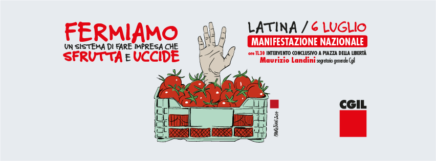 Il 6 luglio la Cgil, assieme alle associazioni della società civile, sarà nuovamente in piazza a Latina per una grande manifestazione nazionale contro il sistema del caporalato e dello sfruttamento nei campi. Il corteo partirà alle ore 9.30 da via Vittorio Cervone per poi arrivare in Piazza del Popolo, dove il segretario generale della Cgil, Maurizio Landini, concluderà la manifestazione.