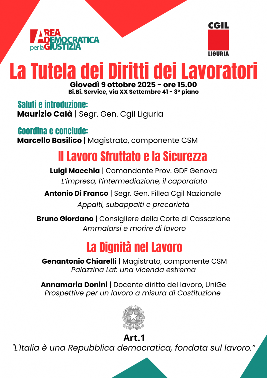 Giovedì 9 ottobre 2025 presso il Bi.Bi. Service in via XX Settembre 41 a Genova a partire dalle ore 15, si terrà il convegno dal titolo “La Tutela dei diritti dei lavoratori”, organizzato da Cgil Liguria e Area Democratica per la Giustizia.