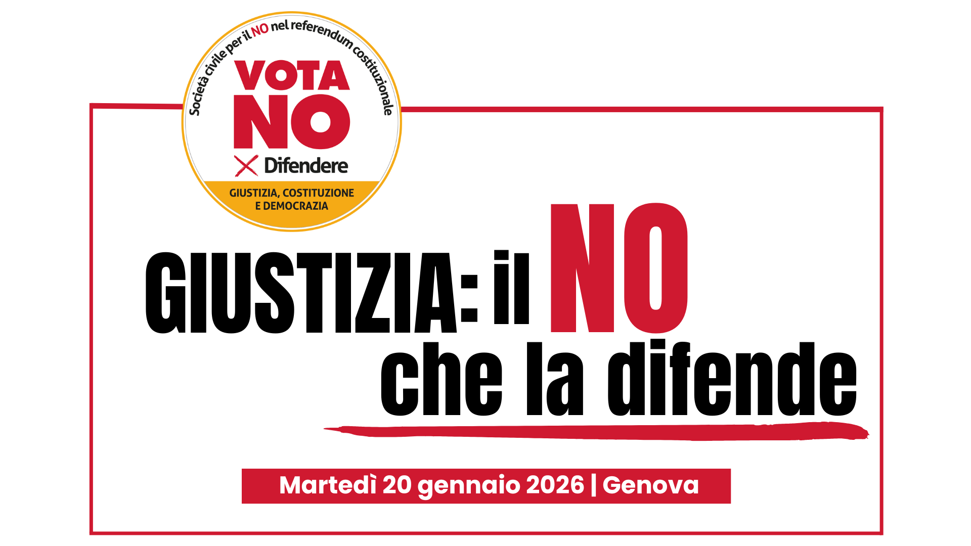 Martedì 20 gennaio 2026 alle ore 14.30 presso i locali del Bi.Bi. Service in via XX Settembre 41 a Genova, si terrà una tavola rotonda dal titolo “Giustizia: il no che la difende”, un momento di confronto e approfondimento sulle ragioni del no al referendum costituzionale, a difesa della giustizia, della Costituzione e della democrazia. L’iniziativa intende offrire un contributo al dibattito pubblico sul referendum sulla giustizia, mettendo al centro il valore dell’autonomia della magistratura, dei diritti e dell’equilibrio costituzionale.