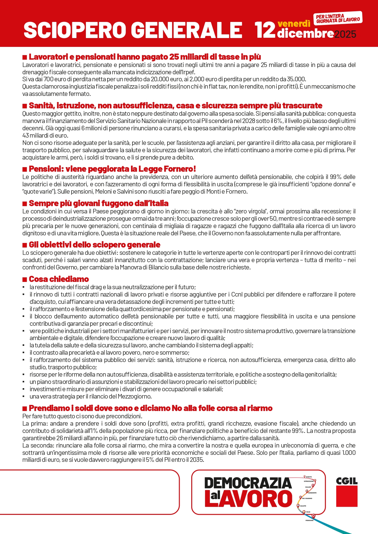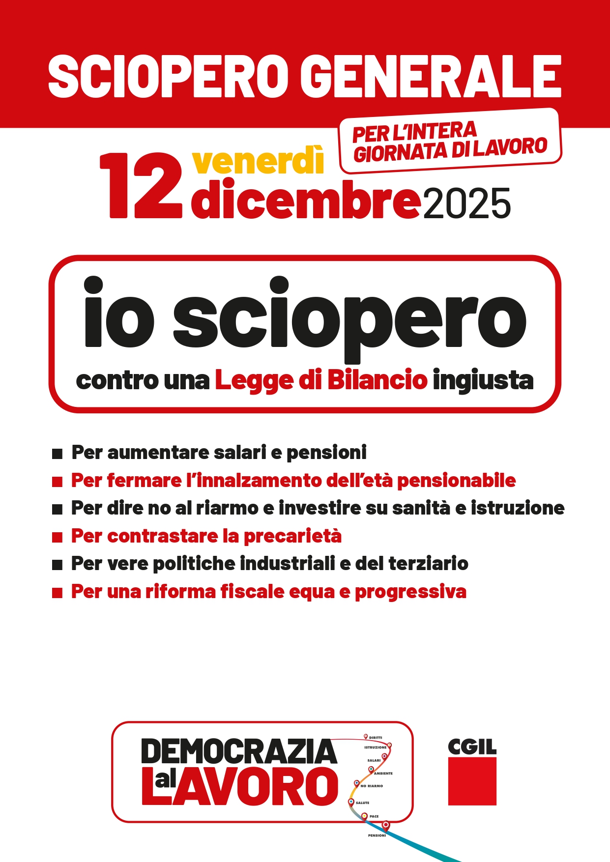Lo sciopero generale ha due obiettivi: sostenere le categorie in tutte le vertenze aperte con le controparti per il rinnovo dei contratti scaduti, perché i salari vanno alzati innanzitutto con la contrattazione; lanciare una vera e propria vertenza – tutta di merito – nei confronti del Governo, per cambiare la Manovra di Bilancio sulla base delle nostre richieste.