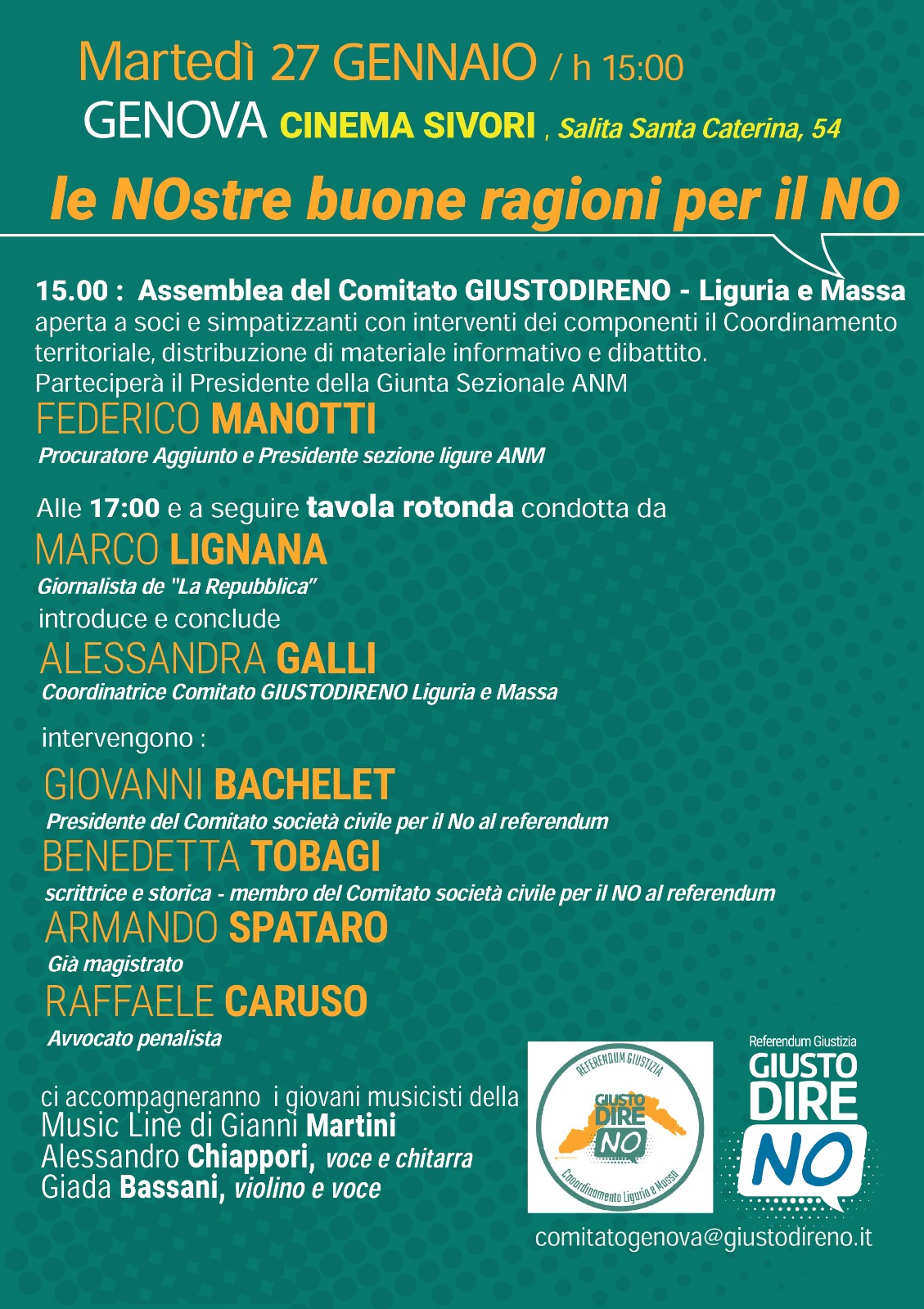 Martedì 27 gennaio 2026 alle ore 15 presso il cinema Sivori di Salita Santa Caterina 54 a Genova si terrà l’iniziativa dal titolo “Le NOstre buone ragioni per il NO”, organizzata da Comitato GIUSTODIRENO Liguria e Massa sui temi del referendum costituzionale sulla giustizia previsto per il 22-23 marzo.