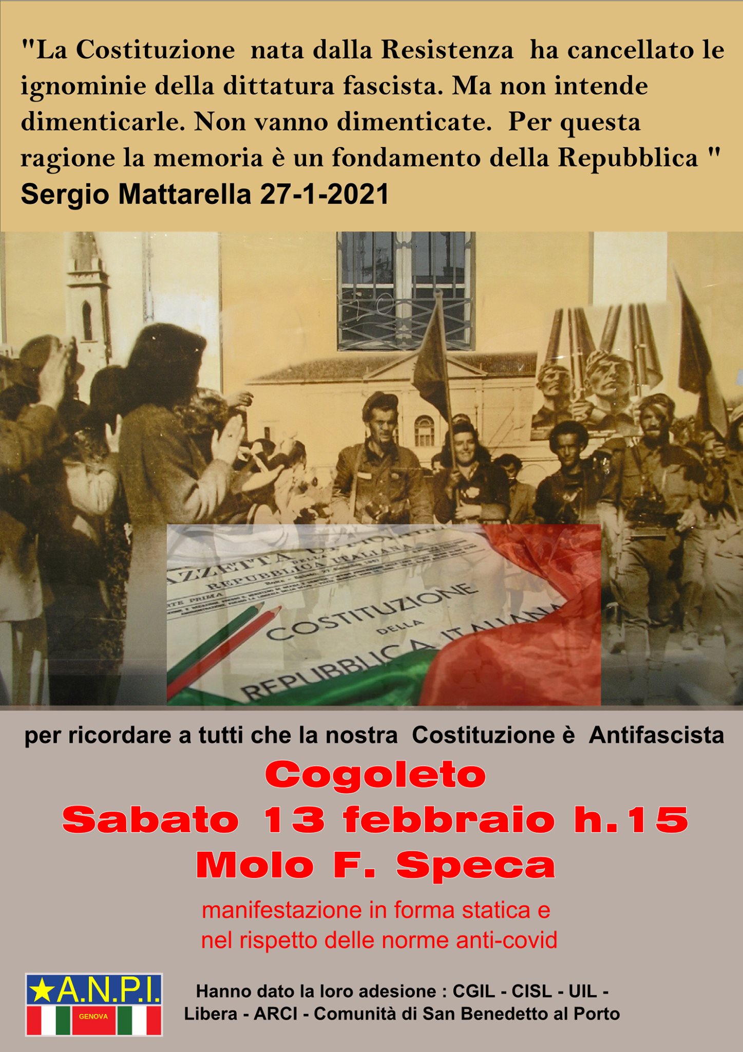 Sabato 13 febbraio 2021 alle ore 15 presso il Molo F. Speca a Cogoleto (altezza Comune di Cogoleto) si terrà un presidio organizzato dall’Anpi al quale la Cgil ha aderito. Il presidio antifascista nasce in risposta a quanto accaduto il 27 gennaio scorso quando tre consiglieri comunali della Lega e di Fratelli d’Italia del Comune di Cogoleto hanno votato scimmiottando il saluto fascista. Atti come questo e quanto accaduto in settimana presso il Consiglio Comunale di Genova dove si è tentato di mettere sullo stesso piano fascismo e comunismo, richiamano alla necessità di un impegno continuo per ribadire i valori sui quali si basa la nostra Costituzione e la Libertà nata dalla lotta Partigiana.