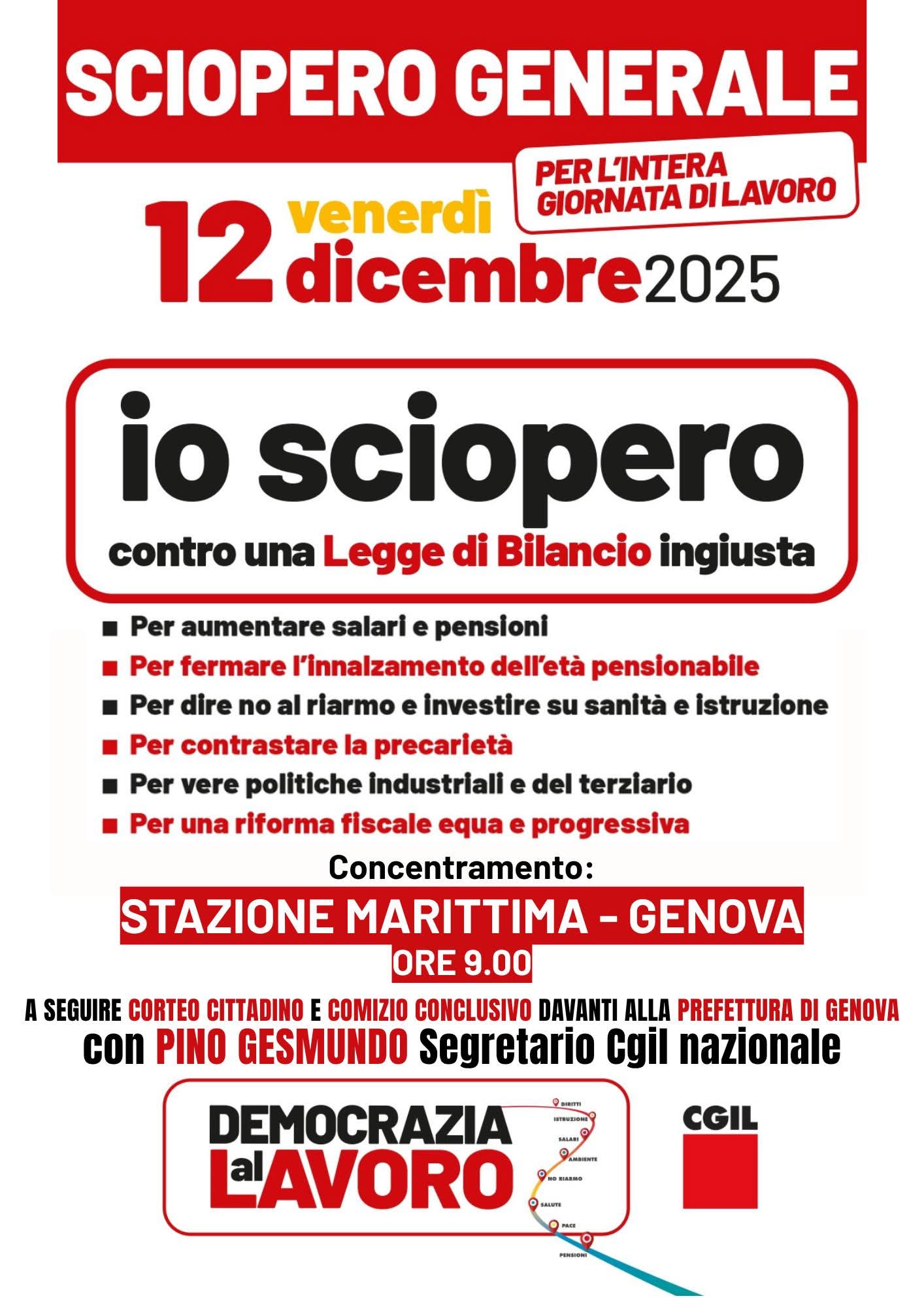 Venerdì 12 dicembre 2025 si terrà lo sciopero generale proclamato dalla Cgil contro una legge di bilancio ingiusta. In Liguria si terrà una manifestazione regionale nella quale confluiranno i manifestanti da tutte le province. L’appuntamento è fissato per le ore 9 davanti alla Stazione Marittima da dove muoverà il corteo verso la sede della Prefettura di Genova.