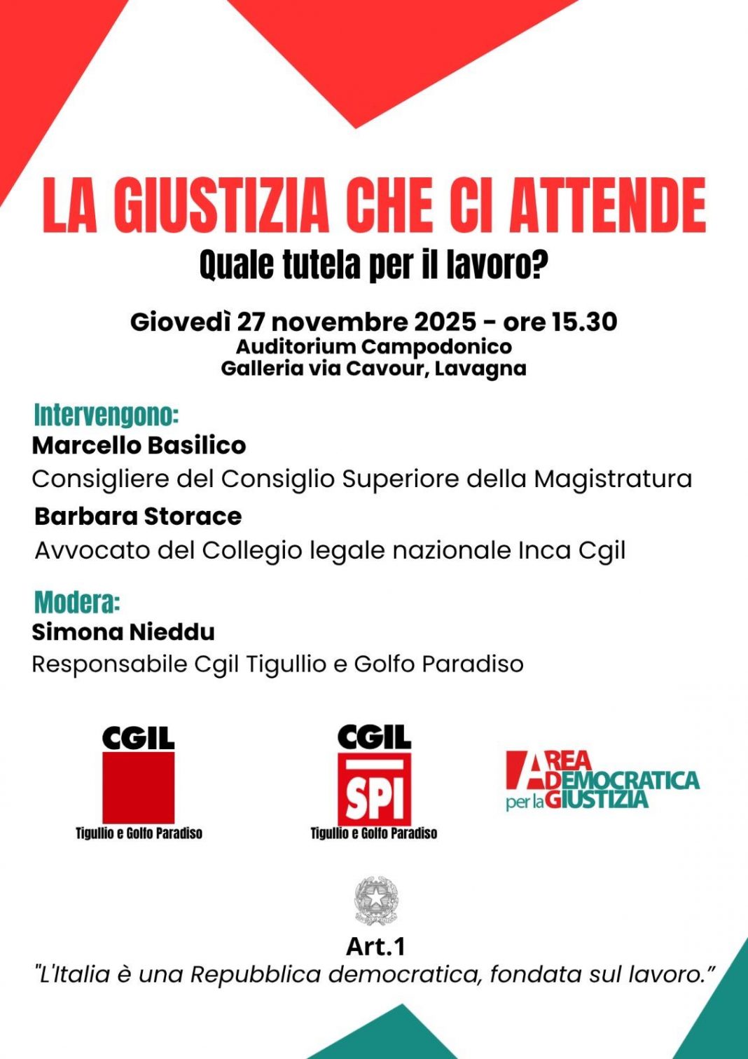 L’iniziativa, che si terrà giovedì 27 novembre alle ore 15.30 presso l’Auditorium Campodonico di Lavagna, vuole approfondire il rapporto tra mondo del lavoro e sistema giudiziario, alla luce delle trasformazioni economiche e sociali in atto e delle sfide legate alla difesa della dignità del lavoro. Intervengono Marcello Basilico, consigliere del Consiglio Superiore della Magistratura e Barbara Storace, avvocato del Collegio legale nazionale Inca Cgil. A moderare l’incontro sarà Simona Nieddu, Responsabile Cgil Tigullio e Golfo Paradiso.