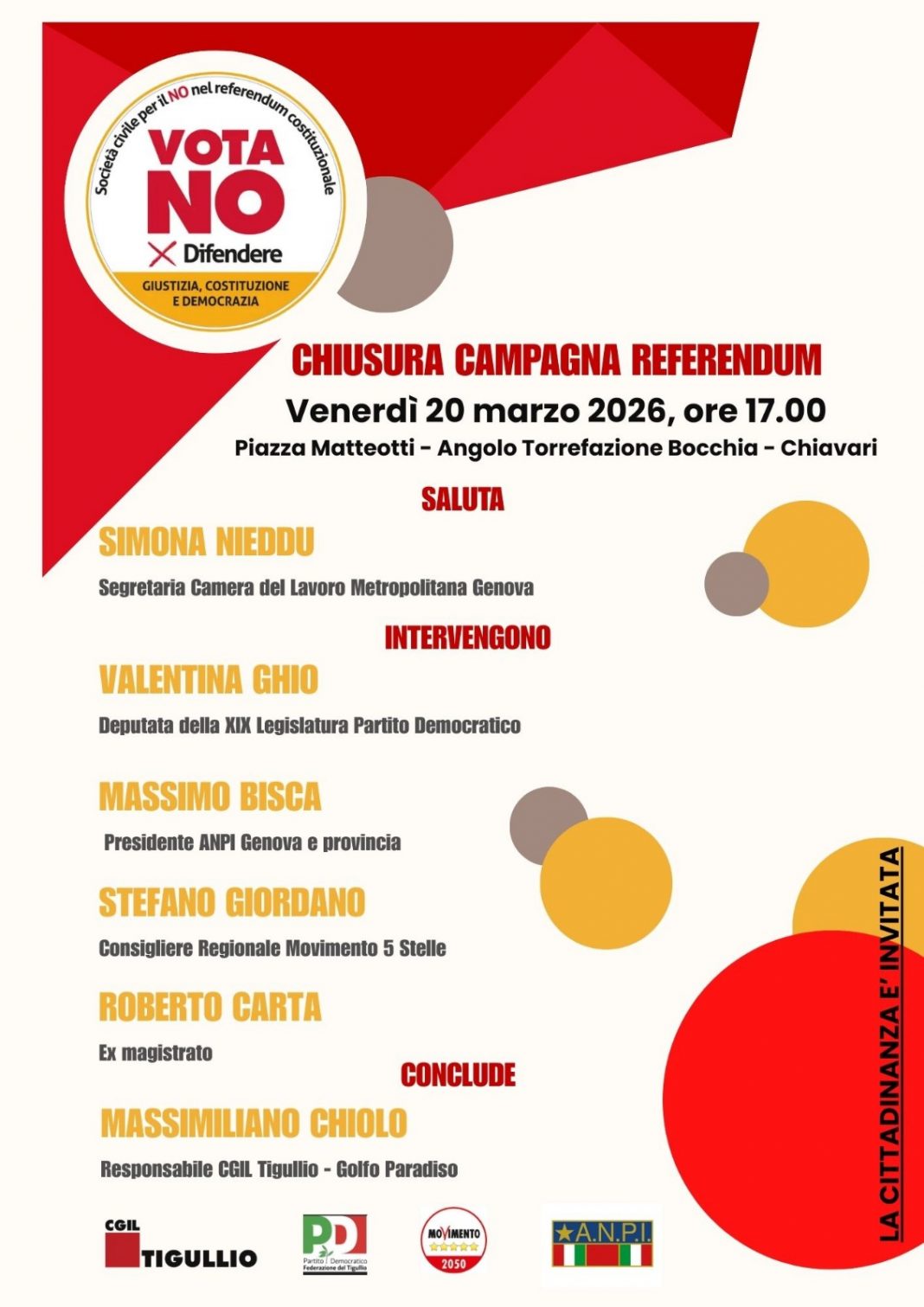 Si terrà venerdì 20 marzo 2026 alle ore 17.00, in Piazza Matteotti (angolo Torrefazione Bocchia) a Chiavari, l’iniziativa di chiusura della campagna referendaria per il no al referendum costituzionale sulla giustizia.