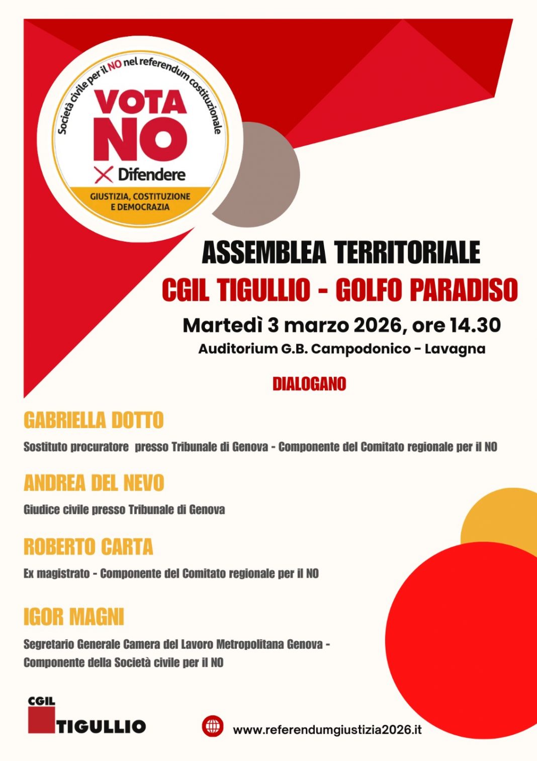 Martedì 3 marzo 2026 alle ore 14,30 presso l’Auditorium G.B. Campodonico in Galleria Via Cavour a Lavagna si terrà un incontro, organizzato dalla Cgil Tigullio Golfo Paradiso, sui temi referendari. Nei giorni scorsi anche nel Tigullio è stato costituito il “Comitato territoriale del Tigullio della Società Civile per il NO al referendum costituzionale sui temi della giustizia” e l’iniziativa del 3 marzo si inserisce nel percorso di sensibilizzazione e informazione alla cittadinanza. All’assemblea parteciperanno Gabriella Dotto Sostituto procuratore presso Tribunale di Genova, Andrea Del Nevo Giudice civile presso il Tribunale di Genova, Roberto Carta ex magistrato, Igor Magni Segretario Generale della Camera del Lavoro di Genova.